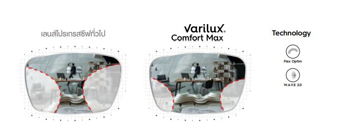 รุ่น Comfort Max เหมาะสำหรับคนที่ใช้งานทั้งวัน เลนส์ถูกออกแบบสำหรับลดภาพบิดเบือนด้านข้างและใช้งานพื้นที่แสงน้อย