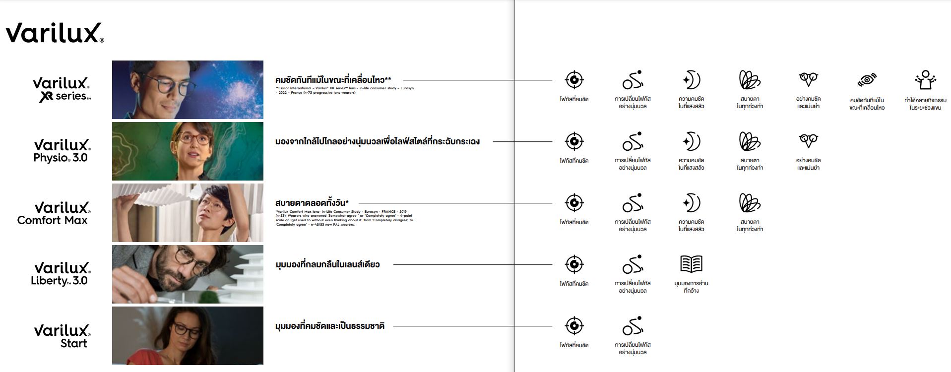 - Live Optics Exclusive Varilux Technologies : ทำให้ภาพคมชัด สบายตา ปรับตัวเร็ว เปลี่ยนโฟกัสนุ่มนวล มุมมองเป็นธรรมชาติ