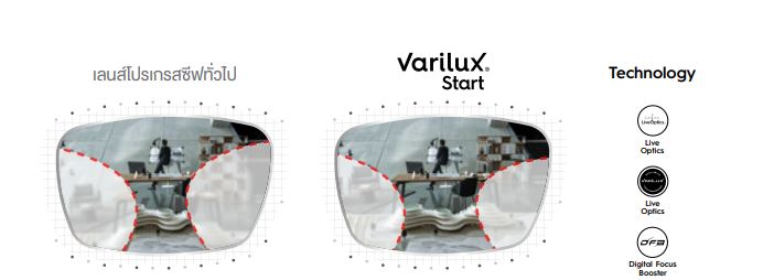 รุ่น Start ด้วย Exclusive Varilux Technologies ทำให้เหมาะสำหรับผู้ที่อยากลองใส่เลนส์โปรเกรสซีฟ แนะนำค่าสายตาเริ่มต้น