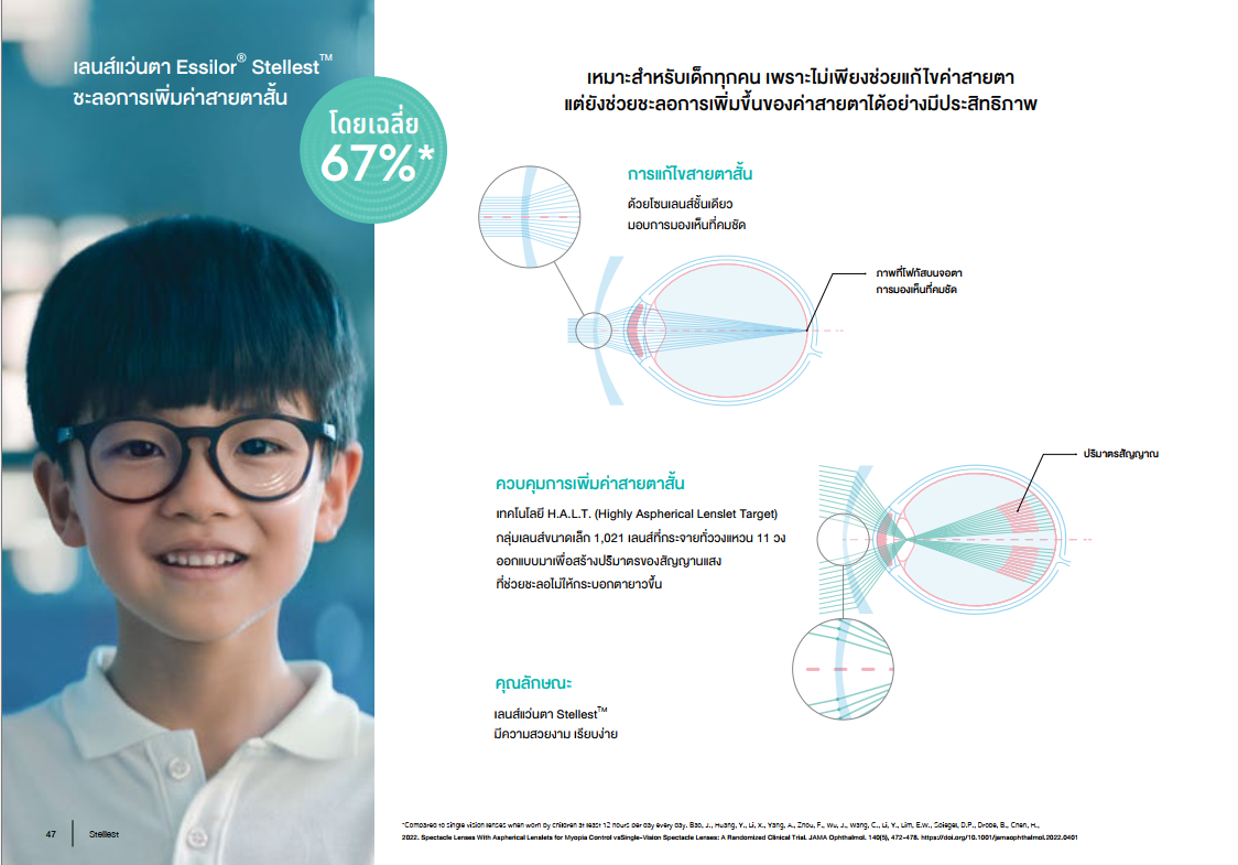 Stellest เลนส์ชะลอการเพิ่มค่าสายตาสั้นที่มีผลถึงเฉลี่ย 67% เมื่อเทียบกับเด็กที่ใส่เลนส์สายตาธรรมดา หากใส่12 ชั่วโมง/วัน