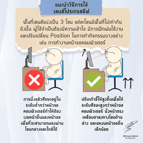 เนื่องจากวิธีการใช้งานเลนส์โปรเกรสซีฟจะแตกต่างไปจากเลนส์ทั่วไป